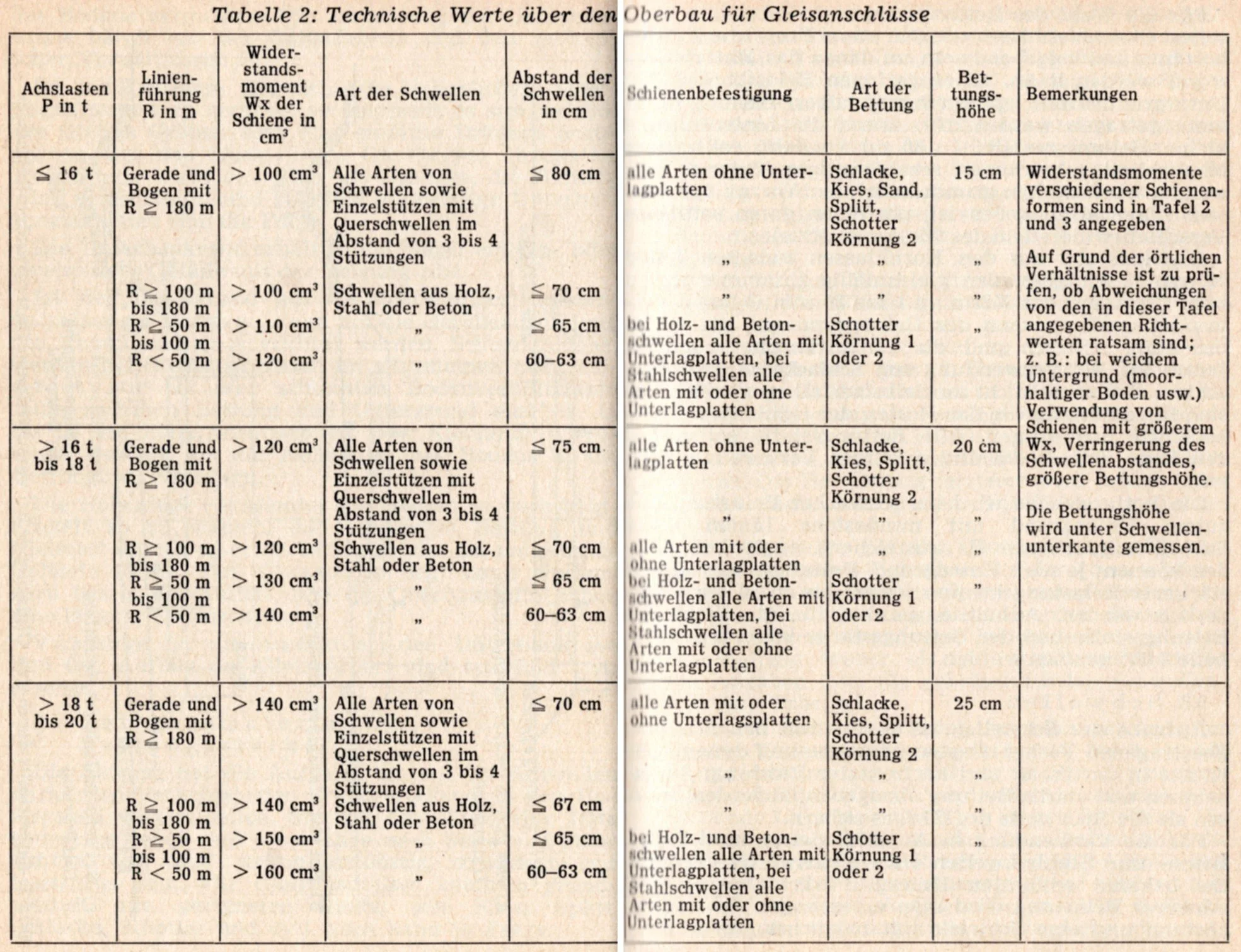 Empfehlungen für den Gleisbau in Anschlussgleisen (1969). Die sehr unterschiedlichen Schwellenabstände für gerade und gebogene Abschnitte sind für den Eisenbahnmodellbau beachtenswert, ebenso die mögliche feinkörnigere Bettung.