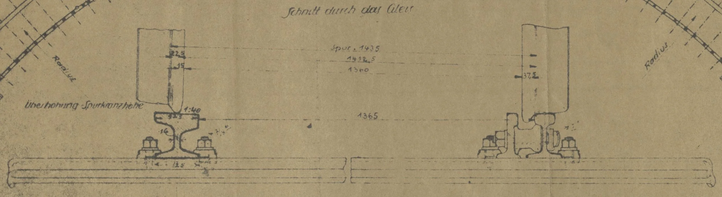 Bei geringen Betriebsgeschwindigkeiten kann der Bogen ohne Überhöhung verlegt werden, die “Überhöhung” durch den Spurkranzlauf (ca. 27 mm) wird als ausreichend angesehen (siehe Zeichnung Klöckner/Landesarchiv Sachsen-Anhalt).
