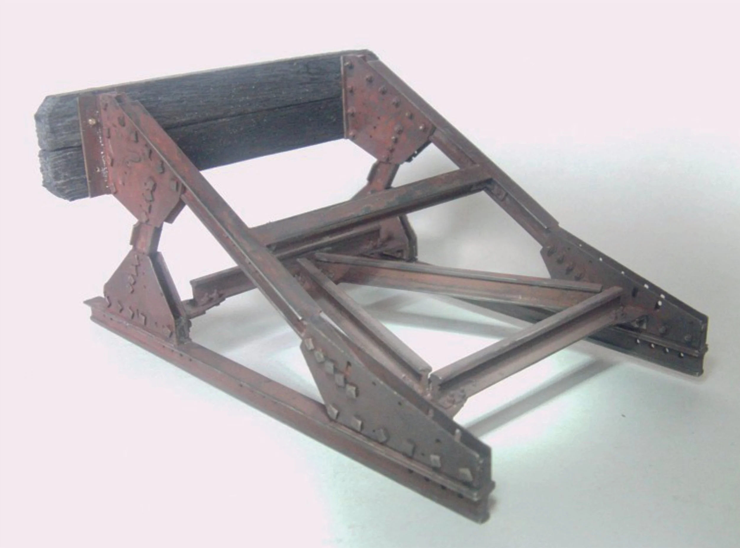 Die Metallkonstruktion wurde gestrahlt und brünniert. Das Modell wurde noch mit einer leicht gebürsteten Bohle aus Eichenschwellen und einem Sh0-Signal (geätzt aus 0,1 mm Neusilber) komplettiert.