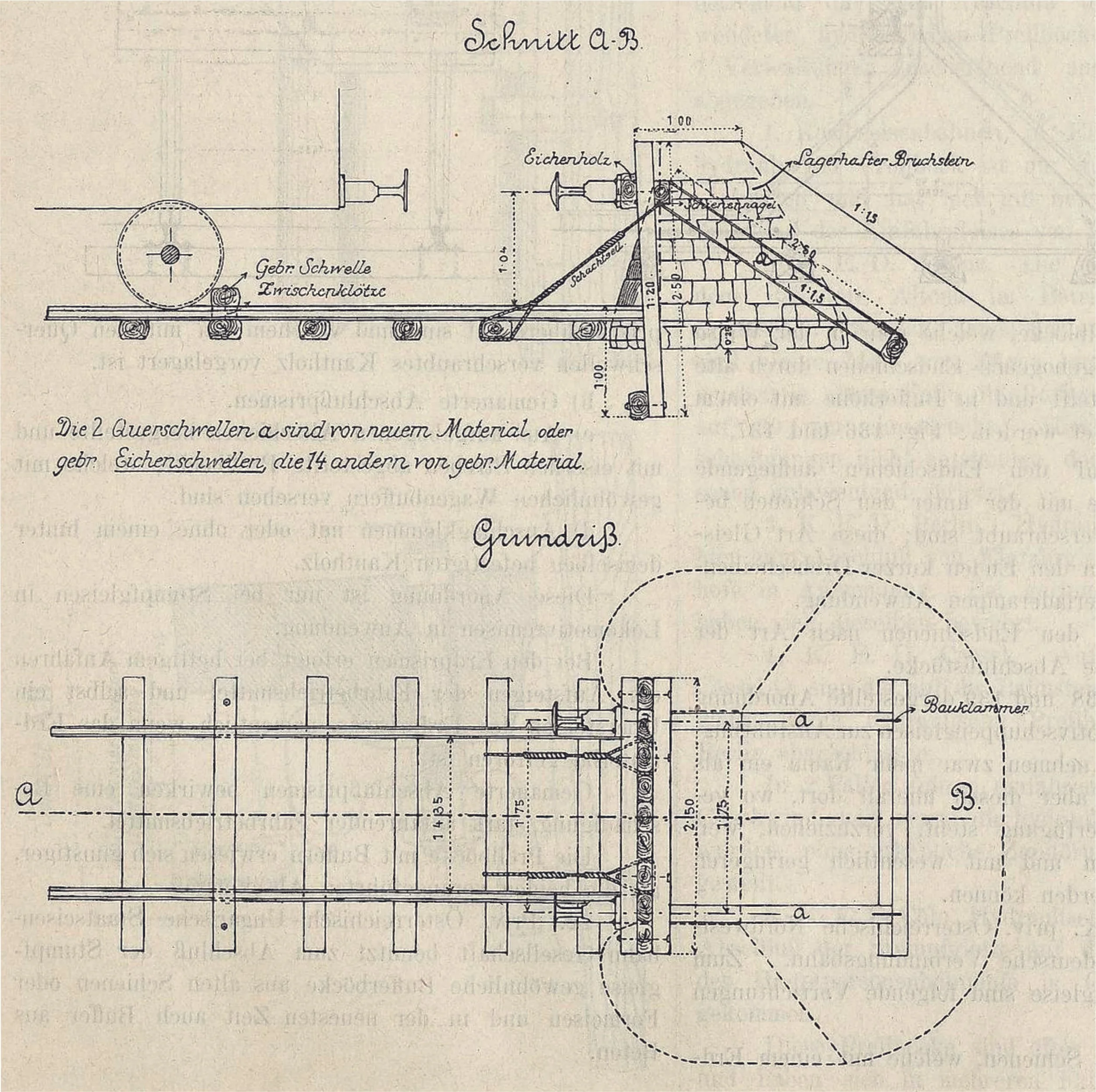 Die Köpfe der Fahrschienen (a) werden von auf dem Kopf stehenden Schienen (b) und einem Holzklotz oder Holzbalken (d) geklemmt. Auf dem Bolzen (e) sitzt noch eine Druckfeder (f), die für Elastizität und gleichbleibenden Druck sorgen soll.